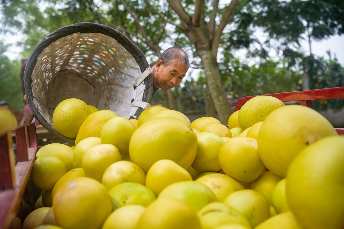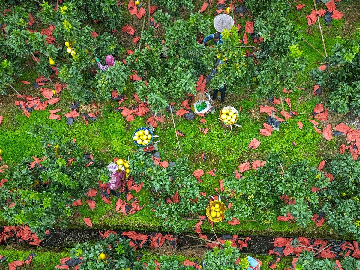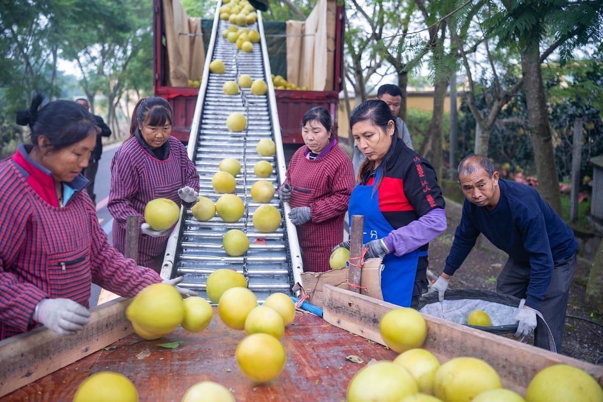 眼下正是柚果丰收的季节,柚农们迎来了一年中最忙碌的时刻。行走在田间地头,尽是被成熟柚果压弯了枝头的柚子树。在眉山市彭山区公义镇霞光家庭农场内,90后种植户魏凤妹正组织摘果队,从自家果园的柚子树上进行下果、装车。几十名摘果队员背着背篼,拿着剪刀,沿着一排排的柚子树采收蜜柚,一派忙碌的丰收景象。