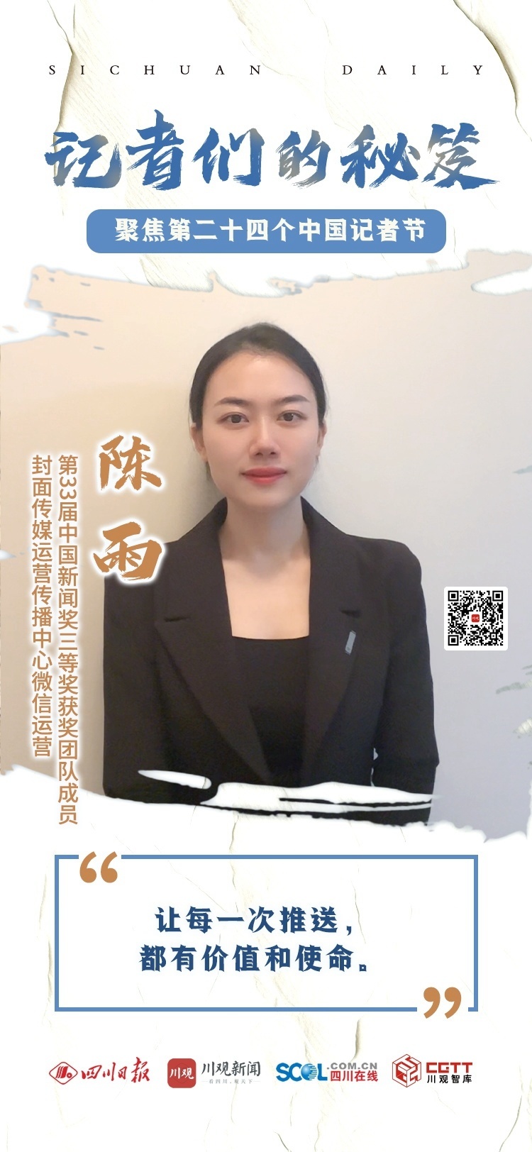 陈雨,封面传媒运营传播中心微信运营,负责封面新闻微信公众号与垂类账号运营。参与创作的融合报道《大国工程我来建》获得第33届中国新闻奖三等奖,主要负责该项目中3D互动游戏的策划设计和运营推广,助力产品实现亿级传播。