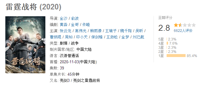 资料显示,这部剧最早的名称是《亮剑3》,随后改名《亮剑之雷霆战将》,到开播之前去掉了“亮剑”之后,才最终以《雷霆战将》的名称播出,然而蹭上了《亮剑》IP的《雷霆战将》却很不好过,甚至可以说之前蹭得有多热,如今扑得就有多惨。