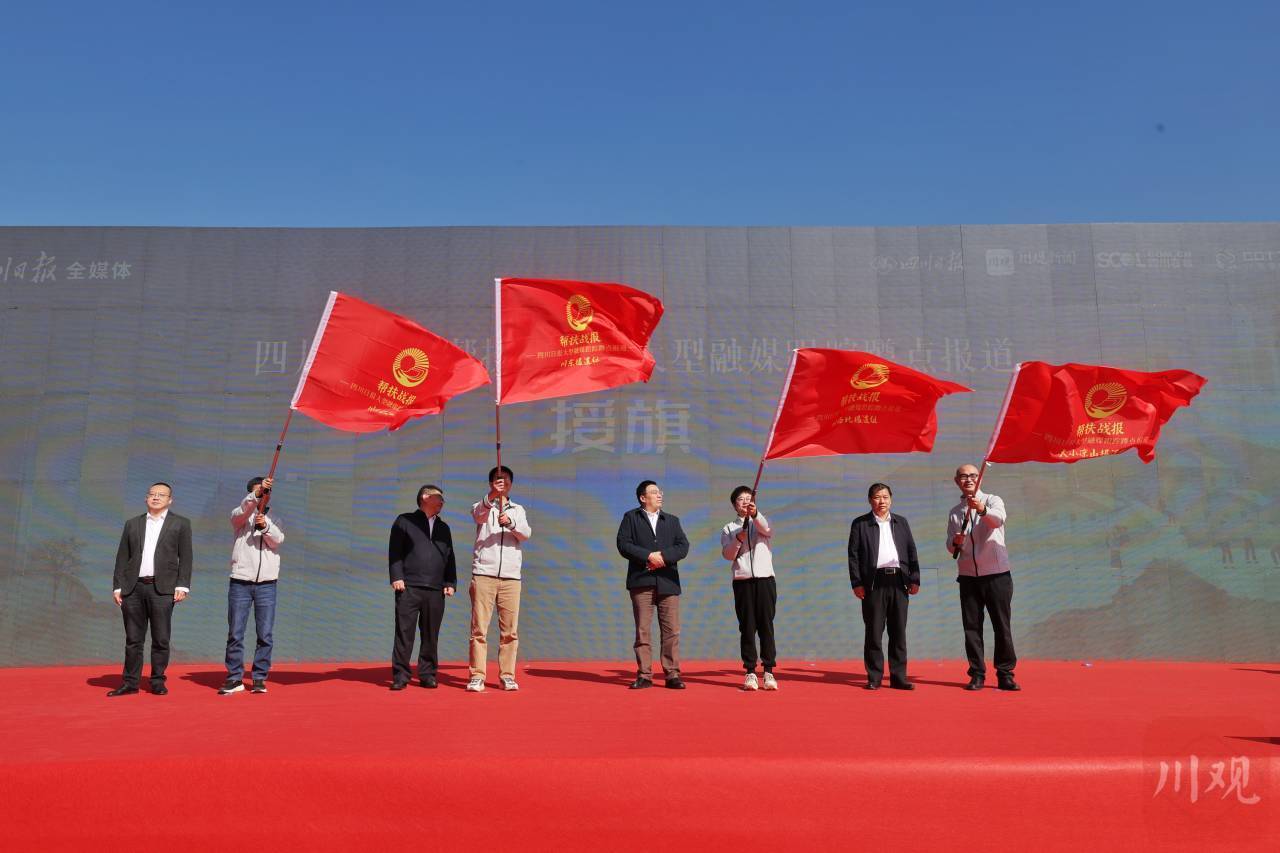 除此之外,四川日报全媒体持续创新手段和方式,综合使用文字、图片、视频等多种方式,展现直播、动画、海报等多种手段,让新闻产品更加多样、让帮扶故事更加生动、让宣传报道更加好看,让发生在帮扶一线的故事传播的更快、更广、更远。上午11时,四位记者舞动手中的战旗。身后,参会嘉宾们在大屏幕上按下手印,四川日报全媒体记者正式出发。