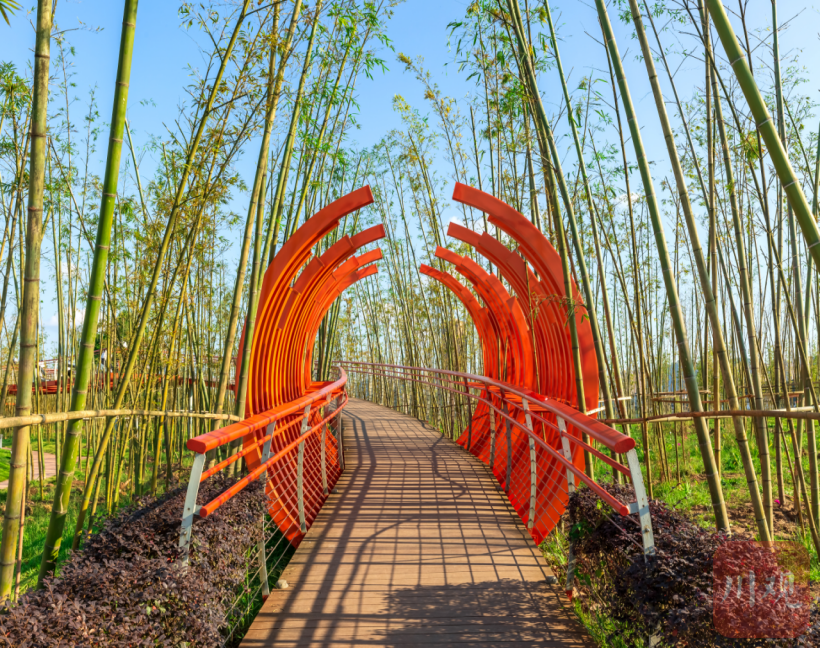 长江竹岛以长江水脉和江安竹脉为线索串连多个景观节点,形成一条3.5公里的活力环线,一条4.5公里的亲水漫步带。岛上配备了学术交流厅、竹博览馆、长江奇石、竹簧工艺品展示厅、儿童游乐场、空中栈道等场景设施,为市民游客提供观、感、识、玩四大类体验。