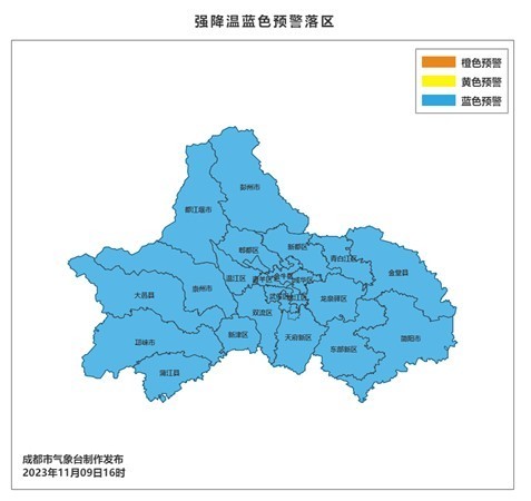成都市气象台2023年11月9日16时00分发布强降温蓝色预警及天气预报:受高空低槽和北方冷空气共同影响,预计10日傍晚到13日我市有一次明显的降温降雨天气过程,日平均气温将累计下降6~8℃,过程累计雨量5~15毫米。冷空气影响时伴有偏北风4~6级,山口河谷地区可达7级或以上。请注意防范强降温、大风和降雨带来的不利影响。