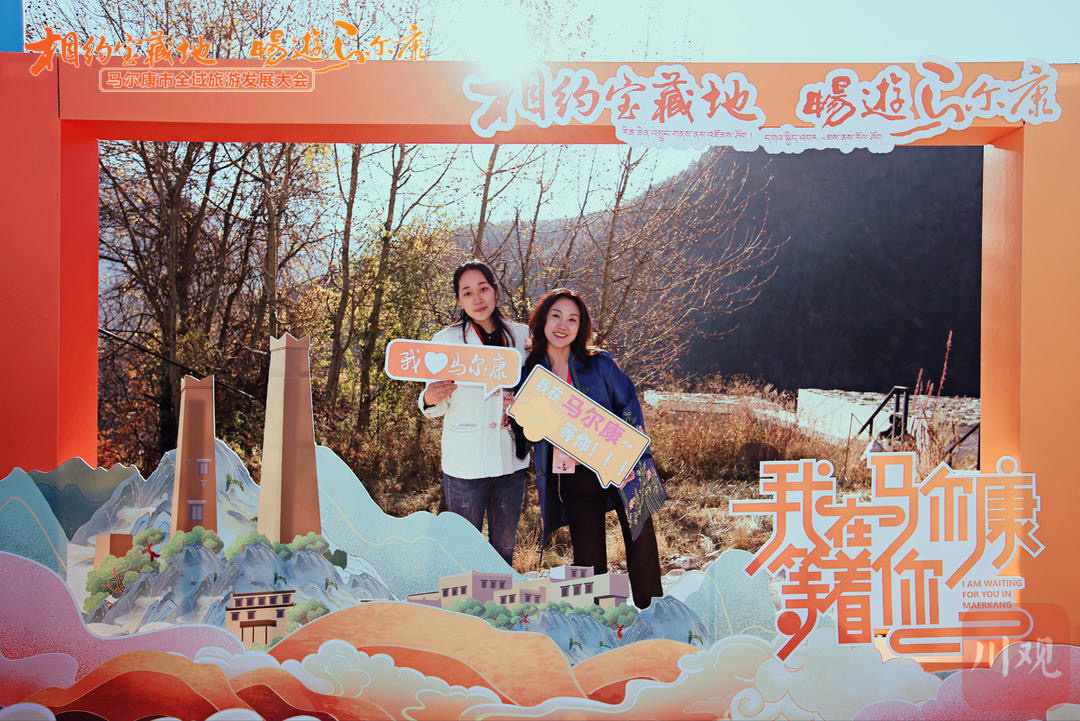 在2023马尔康市全域旅游发展大会现场,游客打卡拍照