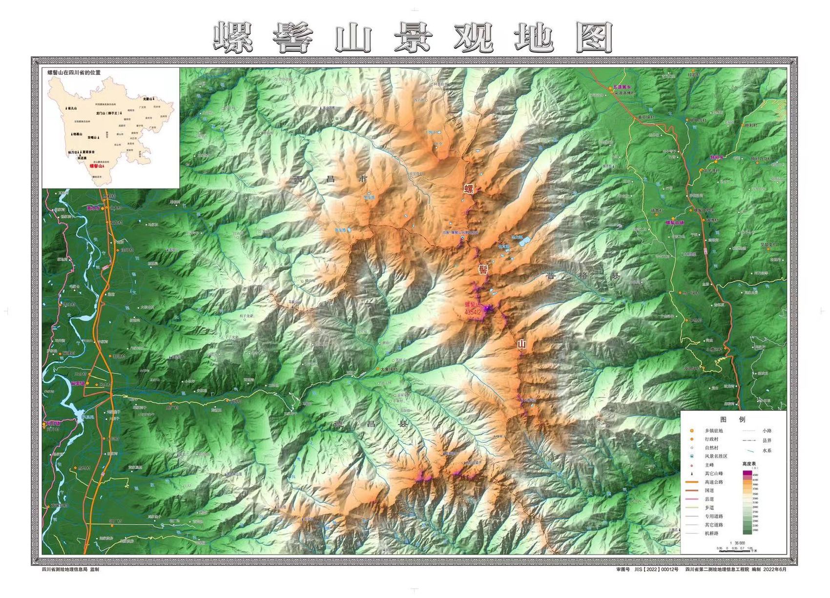 四川省第二测绘地理信息工程院生产技术科科长唐伟介绍,山峰景观地图是一种展示山脉、山峰、地形和周边自然、人文地理要素关系的地图。通过高程分层设色和地貌渲染等技术,在二维平面上呈现出三维立体效果,能更好地帮助用户了解地形的起伏变化和特点。