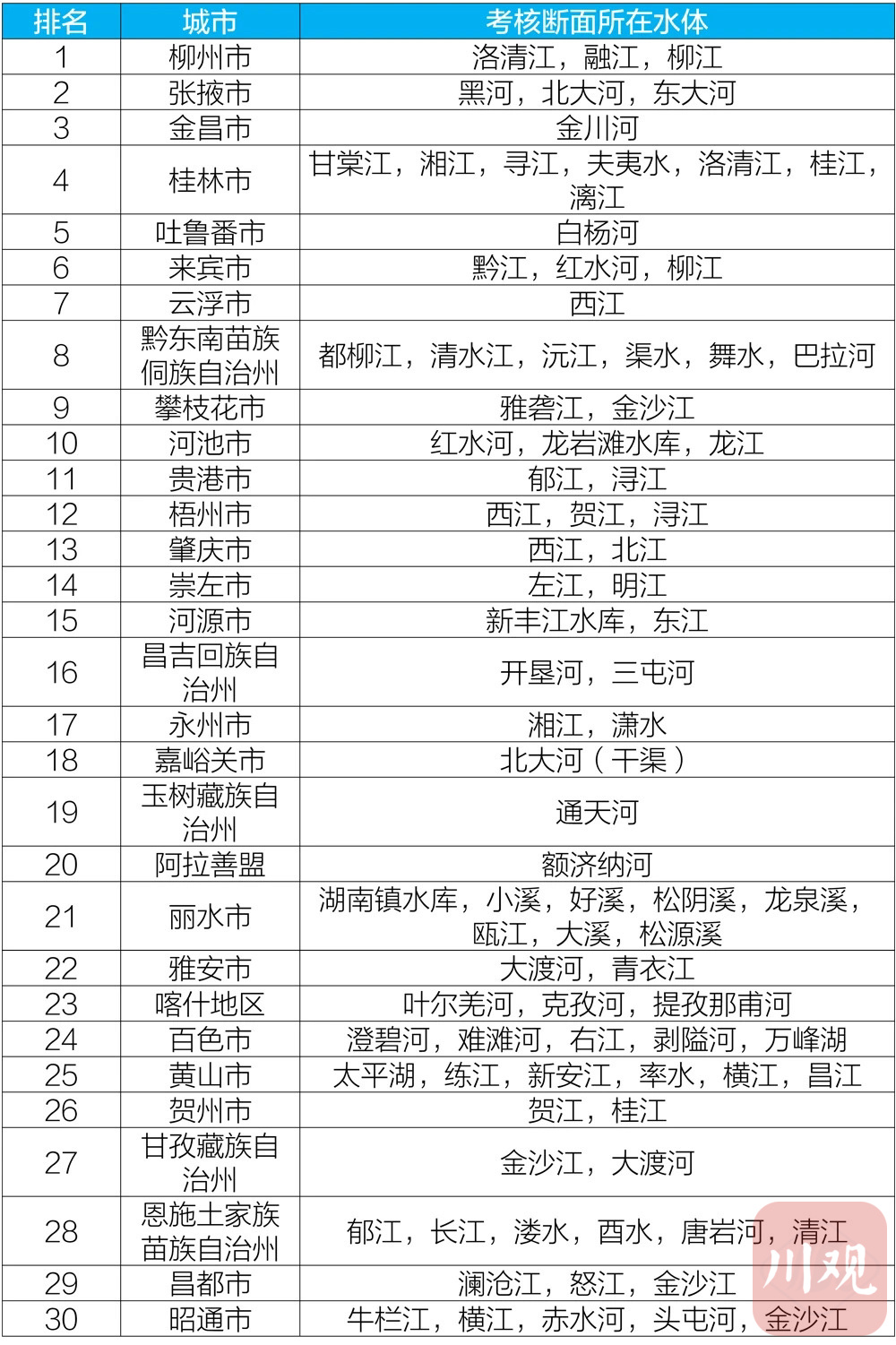 通报显示,2020年1-10月,全国地级及以上城市中,柳州、张掖和金昌等30个城市国家地表水考核断面水环境质量相对较好(从第1名至第30名),铜川、沧州和邢台等30个城市国家地表水考核断面水环境质量相对较差(从倒数第1名至倒数第30名)。