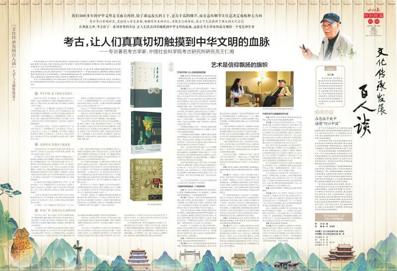 四川日报全媒体“文化传承发展百人谈”大型人文融媒报道持续推出,今日《四川日报》连版推出第九期,专访著名考古学家、中国社会科学院考古研究所研究员王仁湘。在他看来,考古可以穿越时空,直接进入历史层面,唤醒对历史的记忆,寻根自己的传统,在当下尤其提供了强大的文化自信。