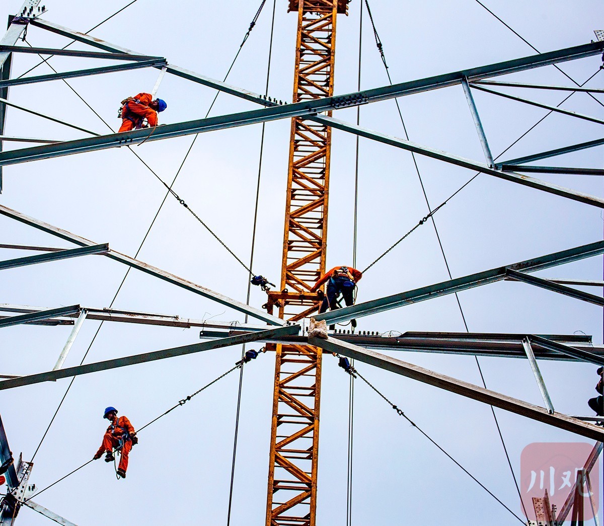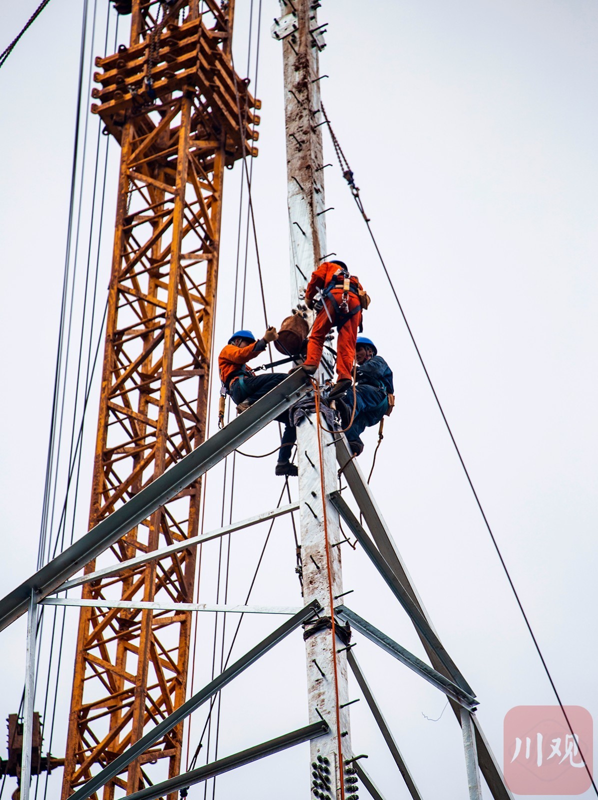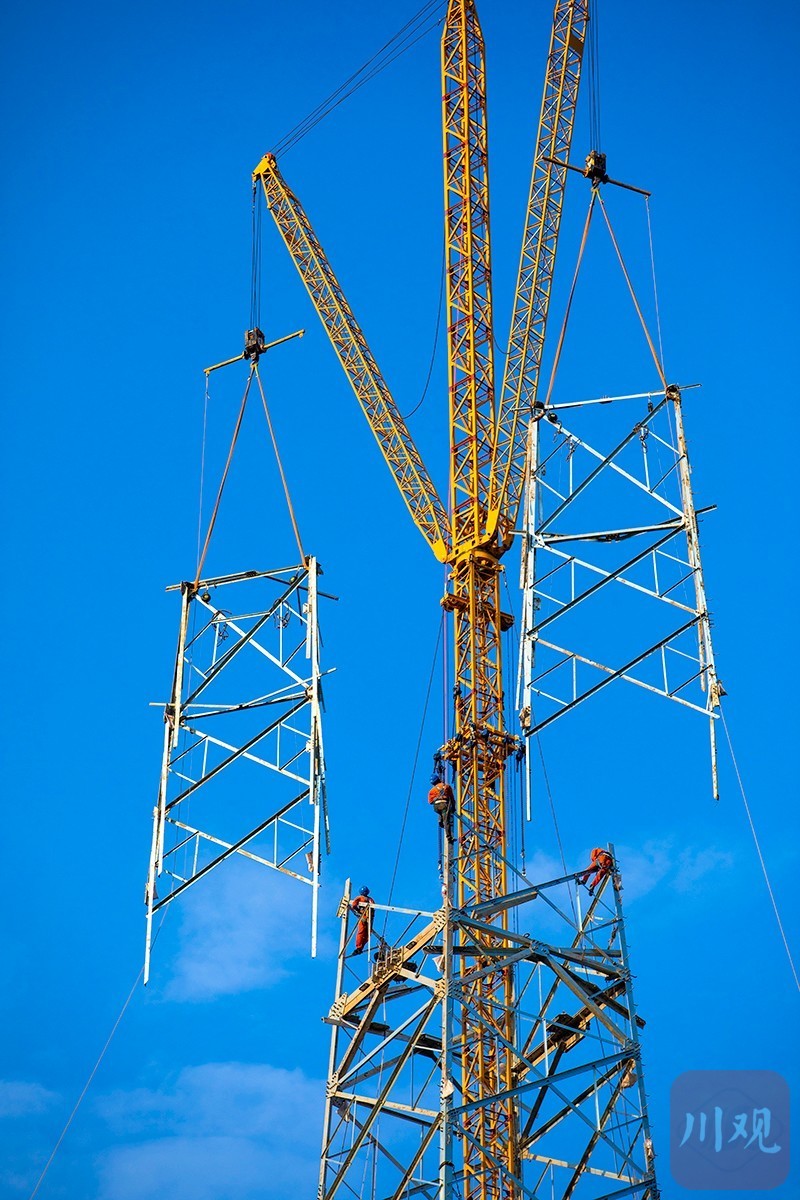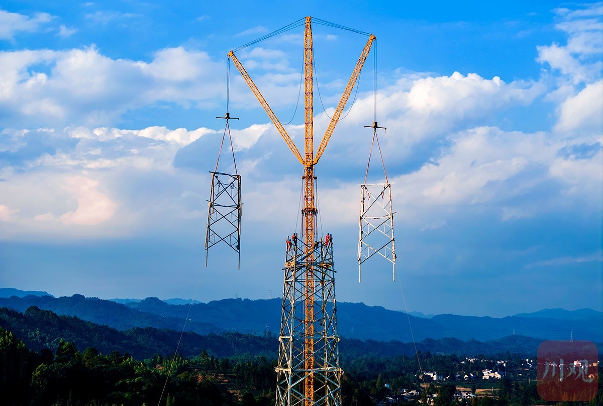 连日来,西南地区首个特高压交流输电工程——川渝1000千伏特高压交流输电工程,正在洪雅县中山镇宋安村开展左右双回线路的抱杆组塔工作。