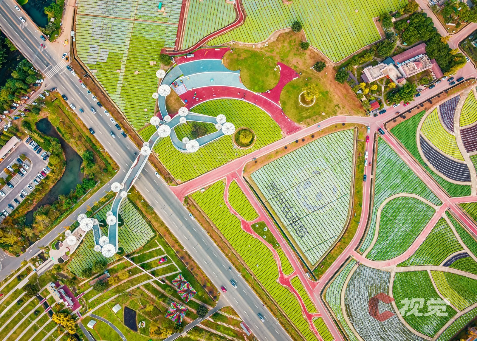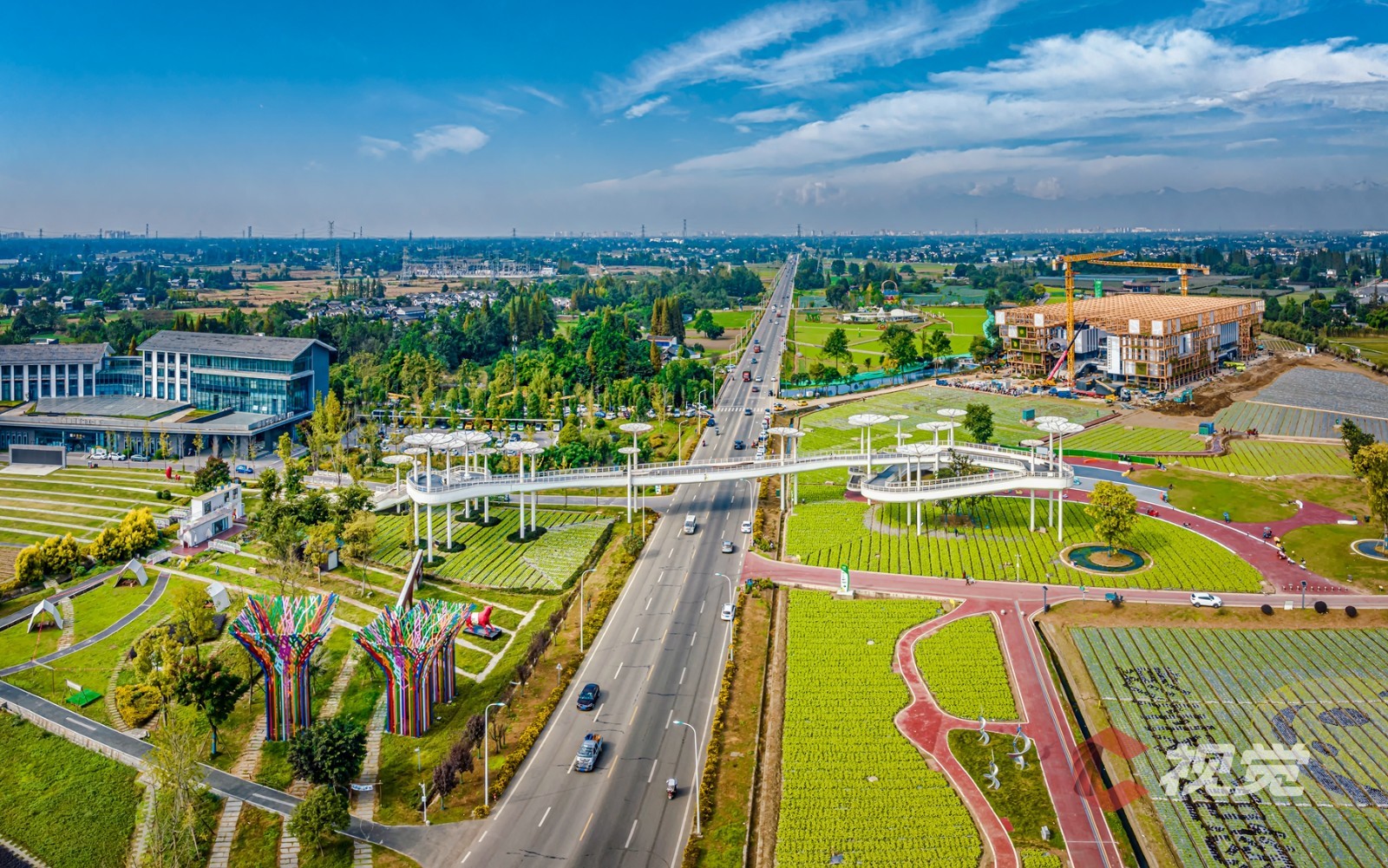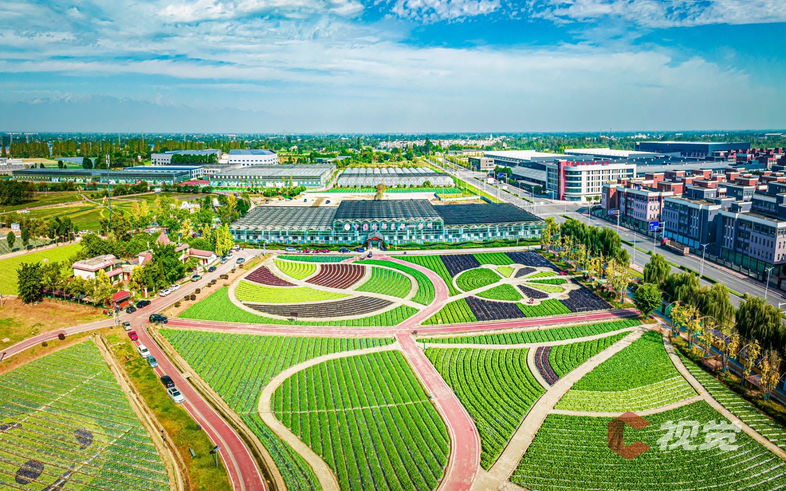 11月22日,第十二届中国·四川(彭州)蔬菜博览会在成都彭州市天府蔬香现代农业产业园开幕,近日,C视觉摄影师袁义明走进“中国蔬菜之乡”彭州市濛阳街道,用镜头俯瞰占地面积约3000亩的彭州天府蔬香博览园。在远处蓝天与雪山的映衬之下,青黄相接的高标准农田、蔬菜种植示范基地、现代化智能温室大棚、体现立体现代农业的蔬香园艺馆、畔水青江民居等纵横交错,构成了一幅美丽田园新画卷。