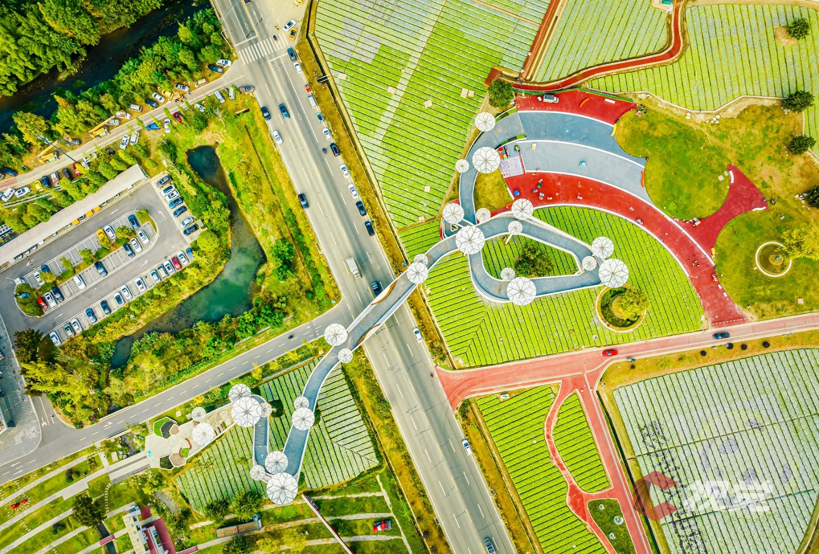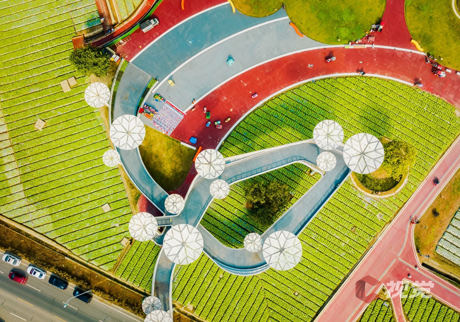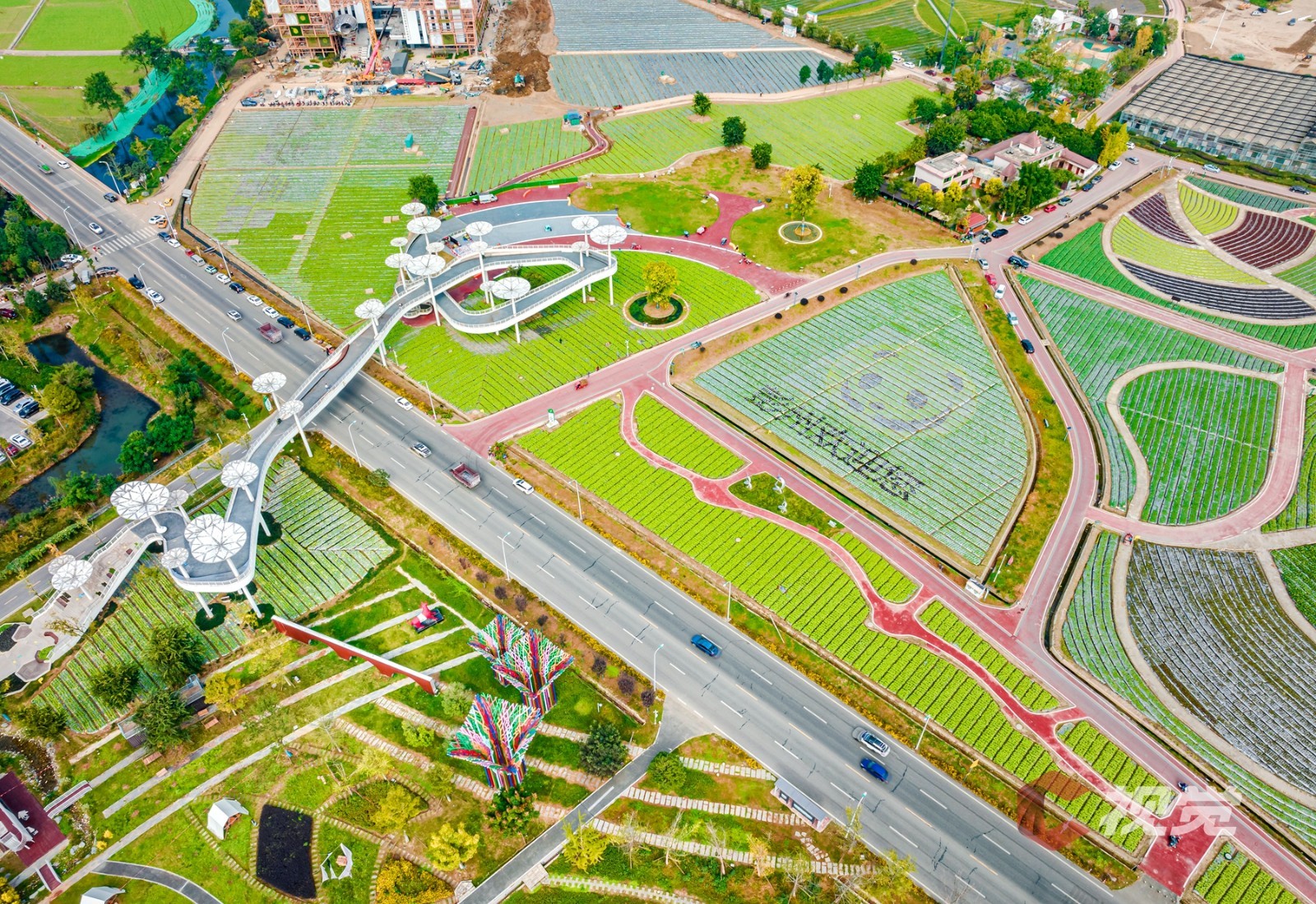 11月22日,第十二届中国·四川(彭州)蔬菜博览会在成都彭州市天府蔬香现代农业产业园开幕,近日,C视觉摄影师袁义明走进“中国蔬菜之乡”彭州市濛阳街道,用镜头俯瞰占地面积约3000亩的彭州天府蔬香博览园。在远处蓝天与雪山的映衬之下,青黄相接的高标准农田、蔬菜种植示范基地、现代化智能温室大棚、体现立体现代农业的蔬香园艺馆、畔水青江民居等纵横交错,构成了一幅美丽田园新画卷。