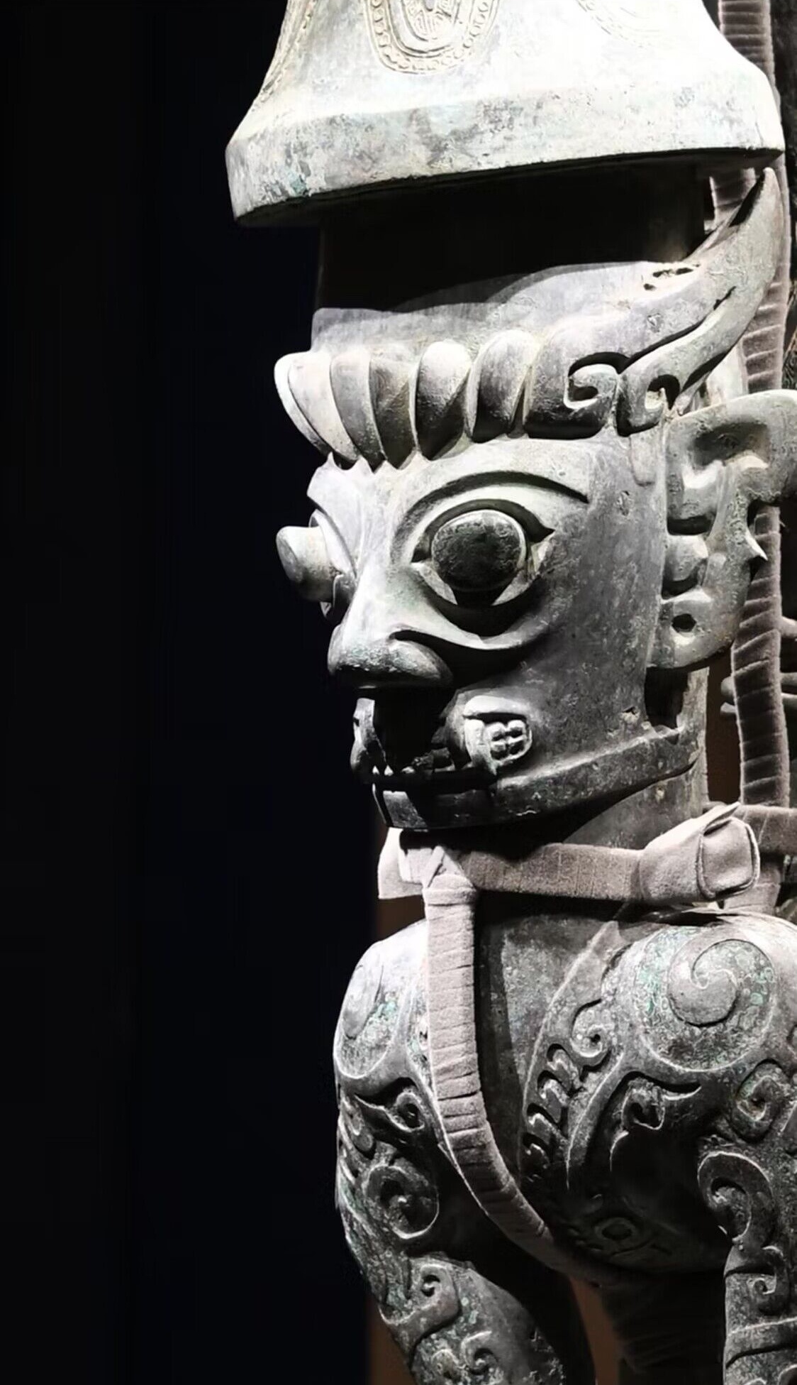 经过研究性修复,如今,这件鸟足曲身人顶尊青铜造像所顶的尊顶部,被发现还站着一位手持权杖或巫杖的青铜人像。“顶端的这个人像,在左右脸颊的位置,都有表示獠牙的装饰,这或许是三星堆人模仿獠牙神的一种方式,也从侧面说明獠牙神在三星堆人信仰中的位置”。