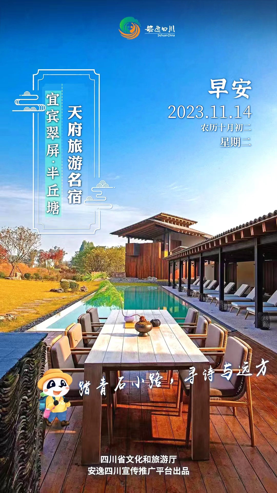 11月14日,星期二。今日安逸四川日历海报“天府旅游名宿”之旅走进宜宾翠屏区半丘塘。