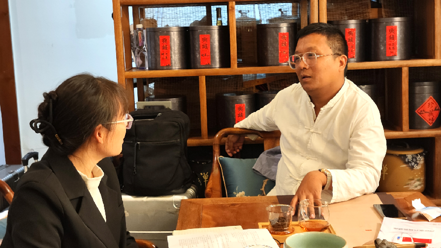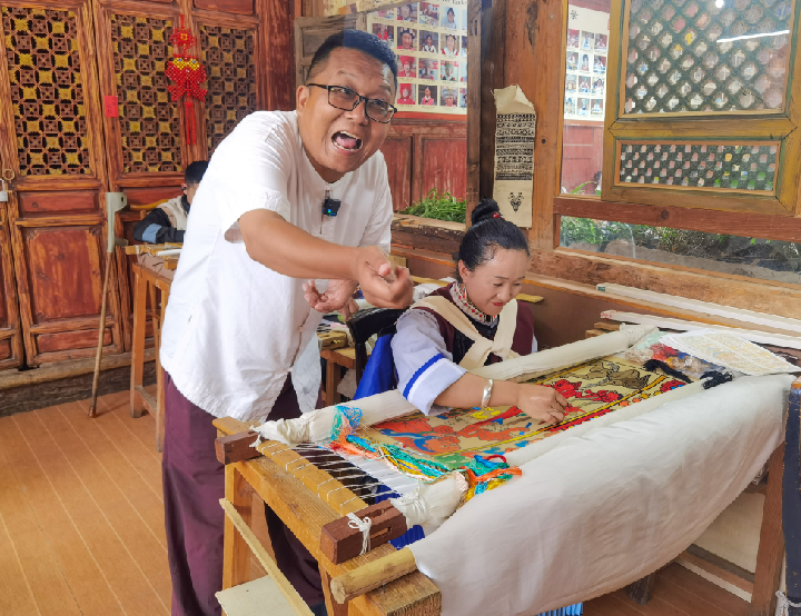 小黑诸鸣在云南拍摄关于纳西刺绣技艺的讲解视频。