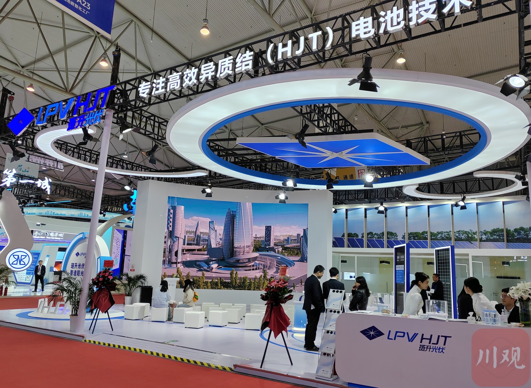 在位于成都世纪城新国际会展中心的2号展馆内,琏升光伏的展区面积不算最大,但人气很高。在一块块深蓝色的光伏组件板前,前来咨询的客商一波接一波,公司总经理唐旋站在展位上,热情向客户介绍产品优势,“我们采用的是HJT异质结电池技术,是第三代高效太阳能电池技术,最大优势就是光电转换效率高。”