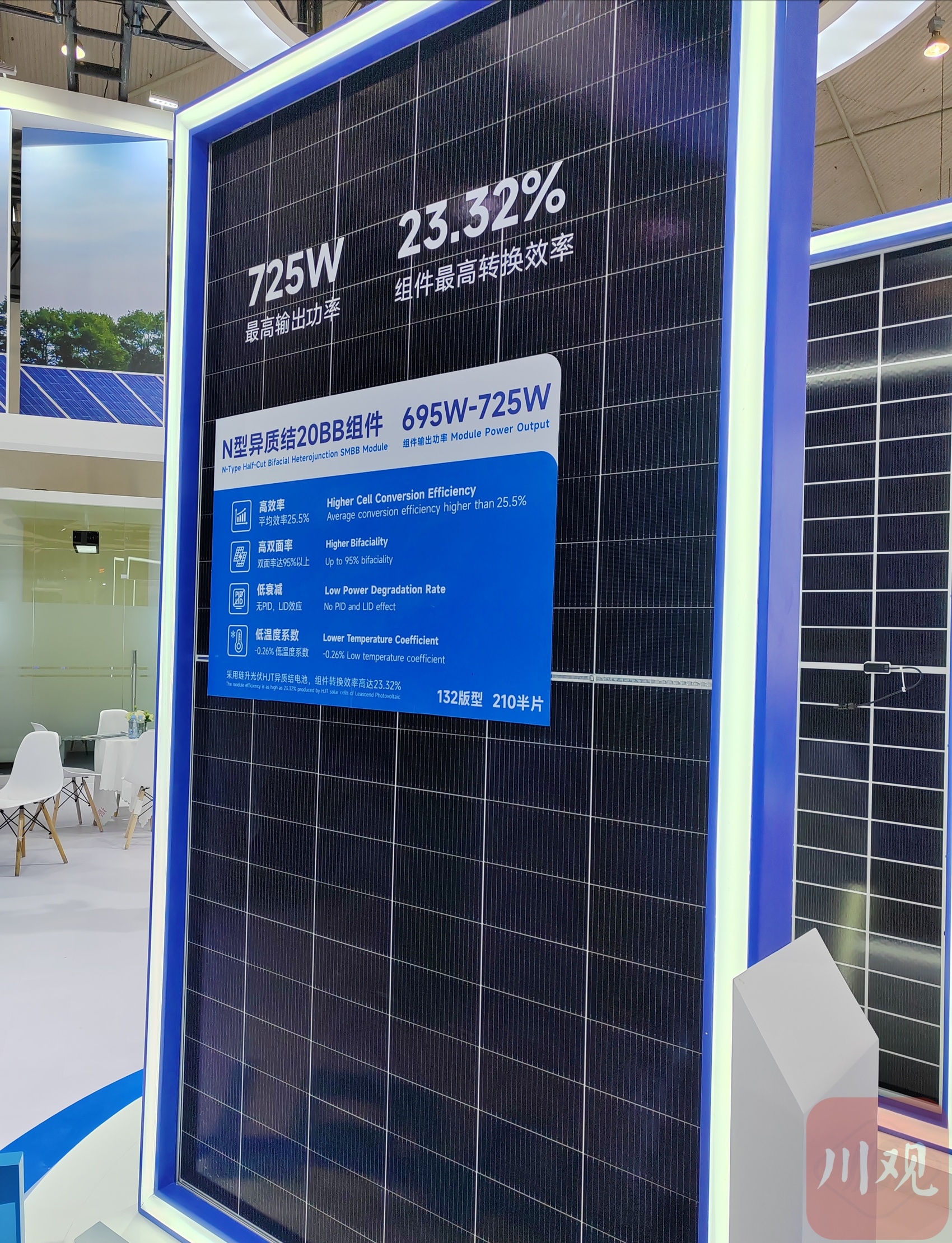 在展区内,一块1人多高、整齐排列着电池片的光伏组件是该公司的明星产品。“这是市面上最大版型的组件,里面有132块太阳能电池,组件最高转换效率可达23.32%,最高输出功率可达725W。”唐旋介绍,如果采用PERC技术,同样大小的组件,最高输出功率约665W,这意味着如果安装1个1GW的光伏电站,用该公司的组件就可以节省10%的土地和10%的线缆支架。