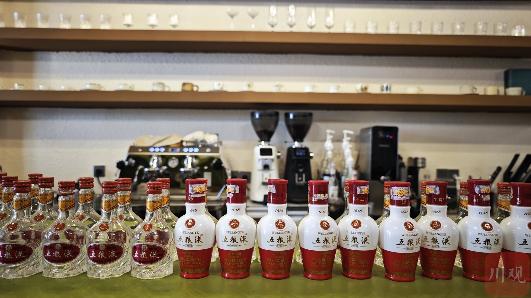 一进门,浓郁的咖啡香气扑面而来,夹着淡淡的酒香,订单台上排列整齐的mini版五粮液瓶小巧又可爱。 “每次用完一瓶五粮液,我们就把空瓶子放在这里作装饰,慢慢地变成了顾客们的拍照打卡点。”咖啡师笑着说。