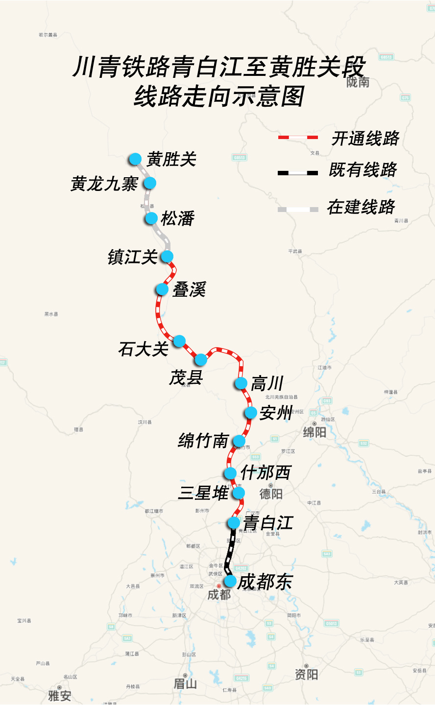 成兰铁路有限责任公司介绍,川青铁路青白江至镇江关段设计时速200公里,为国家Ⅰ级双线铁路。全线共设10个车站,分别为青白江、三星堆、什邡西、绵竹南、安州、高川、茂县、石大关、叠溪和镇江关站,其中青白江为既有车站,其余为新建车站。新建车站中,石大关和叠溪是用于技术作业的越行站,不办理客运业务。