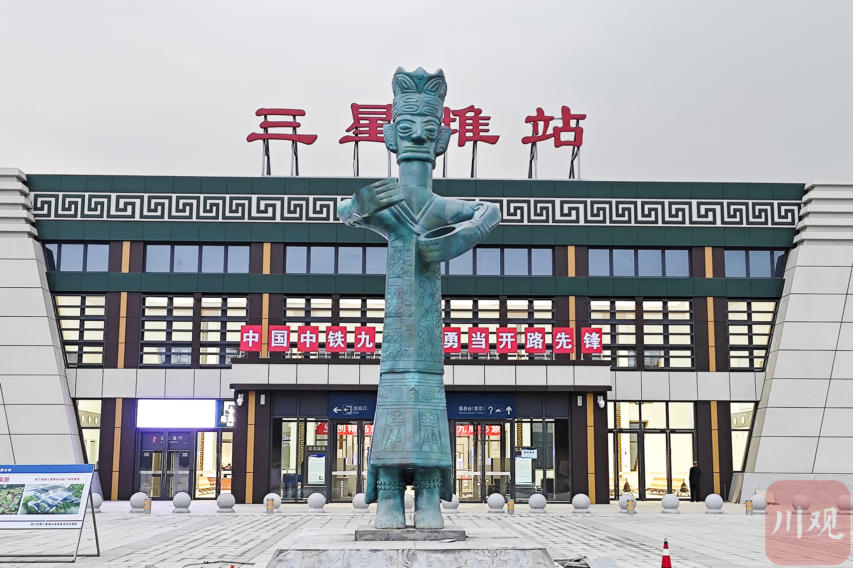车站建筑形式独具匠心。站房将三星堆出土的青铜人面具抽象为站房外立面的整体造型,局部点缀回字纹雕花的仿古元素,同时,装饰装修深化设计中将外立面檐口褐色调整为青铜色,彰显了三星堆深远的人文背景。