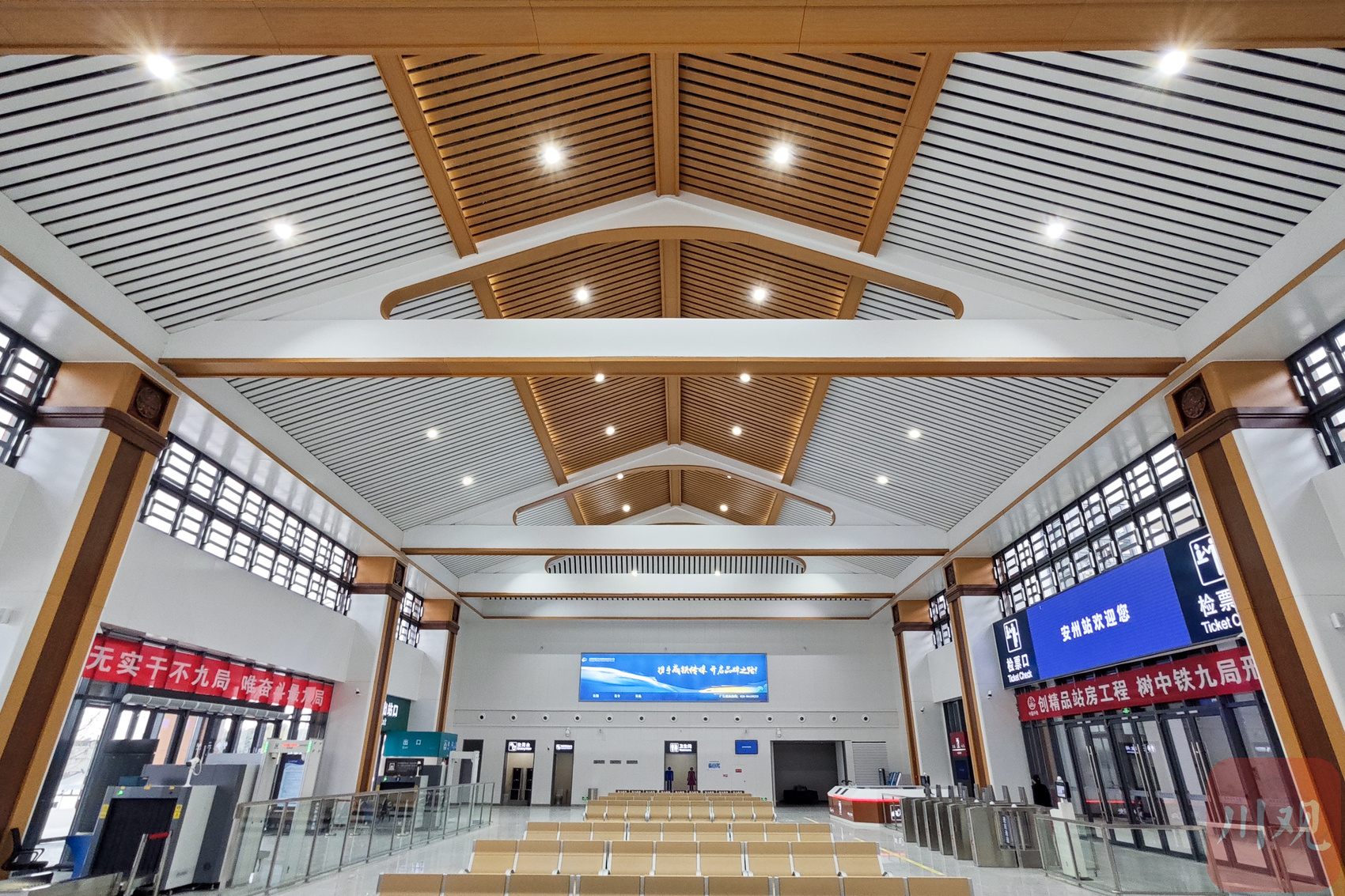 站房设计极具地域特色,整体采用斜屋面造型,建筑形式独具匠心,屋檐跌落起伏、错落有致,整体造型轻盈精巧,体现了川西建筑的特点。候车厅内吊顶采用了三角形屋架和坡面造型,取工程所在地“雎水踩桥”传统习俗的抽象寓意,柱顶采用木雕点缀,与安县深厚的历史背景相得益彰。