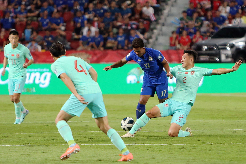 首发阵容中,中国男足主教练扬科维奇派出了多名年过30岁的老将,包括35岁的谭龙、34岁的吴曦、张琳芃、32岁的武磊、颜骏凌,利用老将的比赛经验确保城门不失的意图十分明显。比赛开始后,双方在经过前10分钟的互相试探之后开始了对攻,而中国男足也在顶住对方“三板斧”之后,开始利用反击威胁对方球门。第23分钟,泰国队利用中国男足进攻未果,打出快速反击,并由沙拉奇射门得手,率先打破场上僵局。7分钟之后,韦世豪助攻武磊,帮助中国男足快速扳平比分。纵观整个上半场,中国男足球员心态平稳,场上执行战术比较到位,正常发挥了自己的水平。