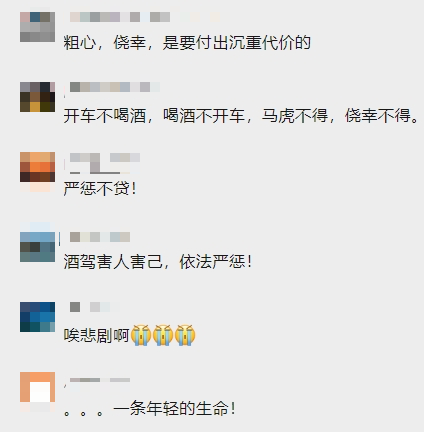 警方提醒:广大驾驶员要汲取此次事故教训,珍爱生命敬畏法律,安全驾驶,文明出行。公安机关将依法严厉打击酒后驾驶等违法犯罪行为。为避免给受害者家庭造成二次伤害,请广大市民群众不要再传播相关音像资料,自觉做到不信谣、不造谣、不传谣。