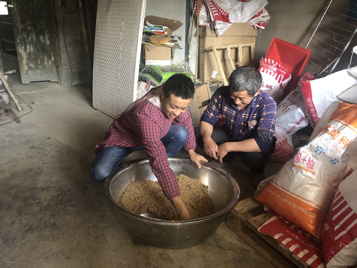 11月9日下午,在古佛台村一组,黄德学半蹲在地,抓起一把刚和好的饲料,手把手地教身边的刘小平,“这个饲料和蛋白粉,还有水的比例要弄好,不然小猪不爱吃。”
