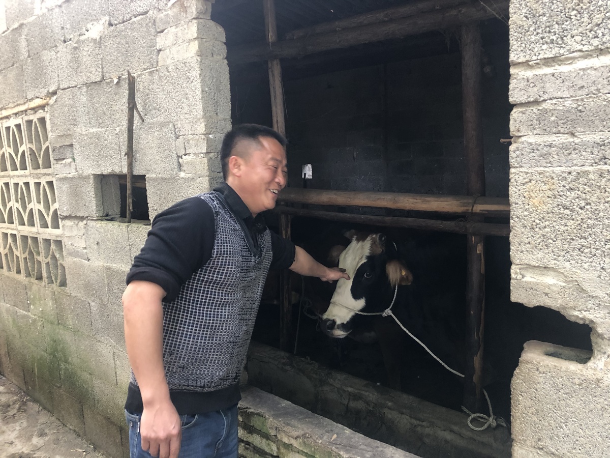 兴文县大坝苗族乡古佛台村,脱贫致富的村民万正林和他饲养的肉牛在一起,通过养牛,万正林家一年的收入达到20万元。