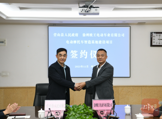 徐州欧王电动车业有限公司的电动摩托车智造基地建设项目落地营山签约现场。彭传桁摄