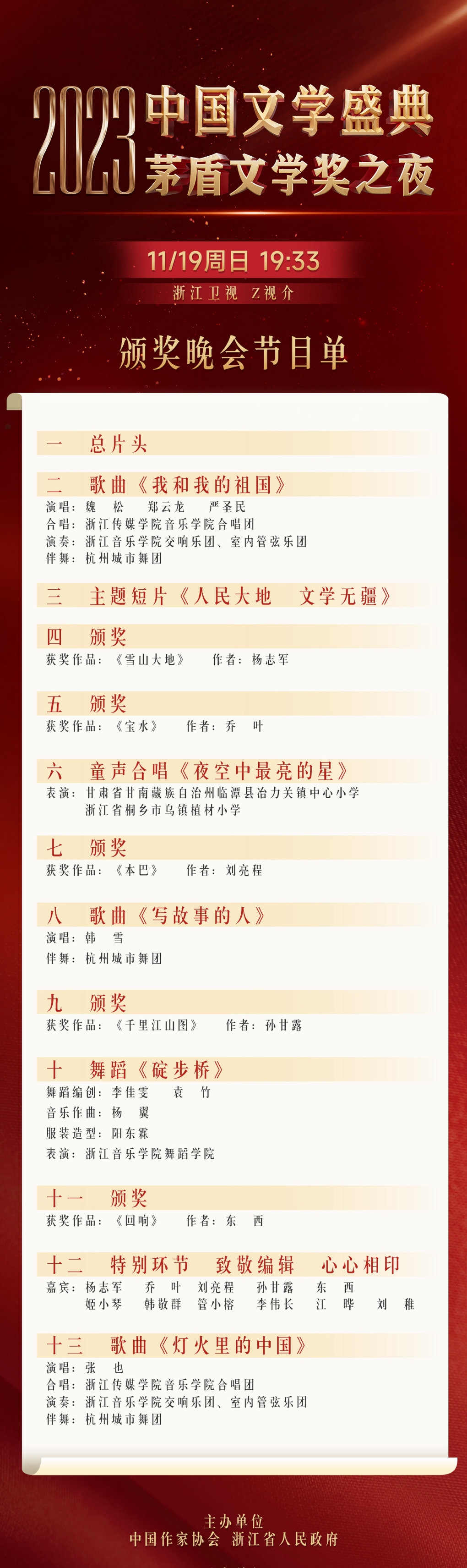 11月19日晚7点30分,“2023中国文学盛典·茅盾文学奖之夜”将于茅盾故里浙江桐乡乌镇举行。第十一届茅盾文学奖获奖作家,编辑、出版社、评委代表,港澳台作家代表,网络文学作家代表,中国作协主席团委员、全委会委员以及所属各单位部门负责人等,汇聚这片烟雨江南的诗意土地,沐浴文学荣光,抒发文学情怀。