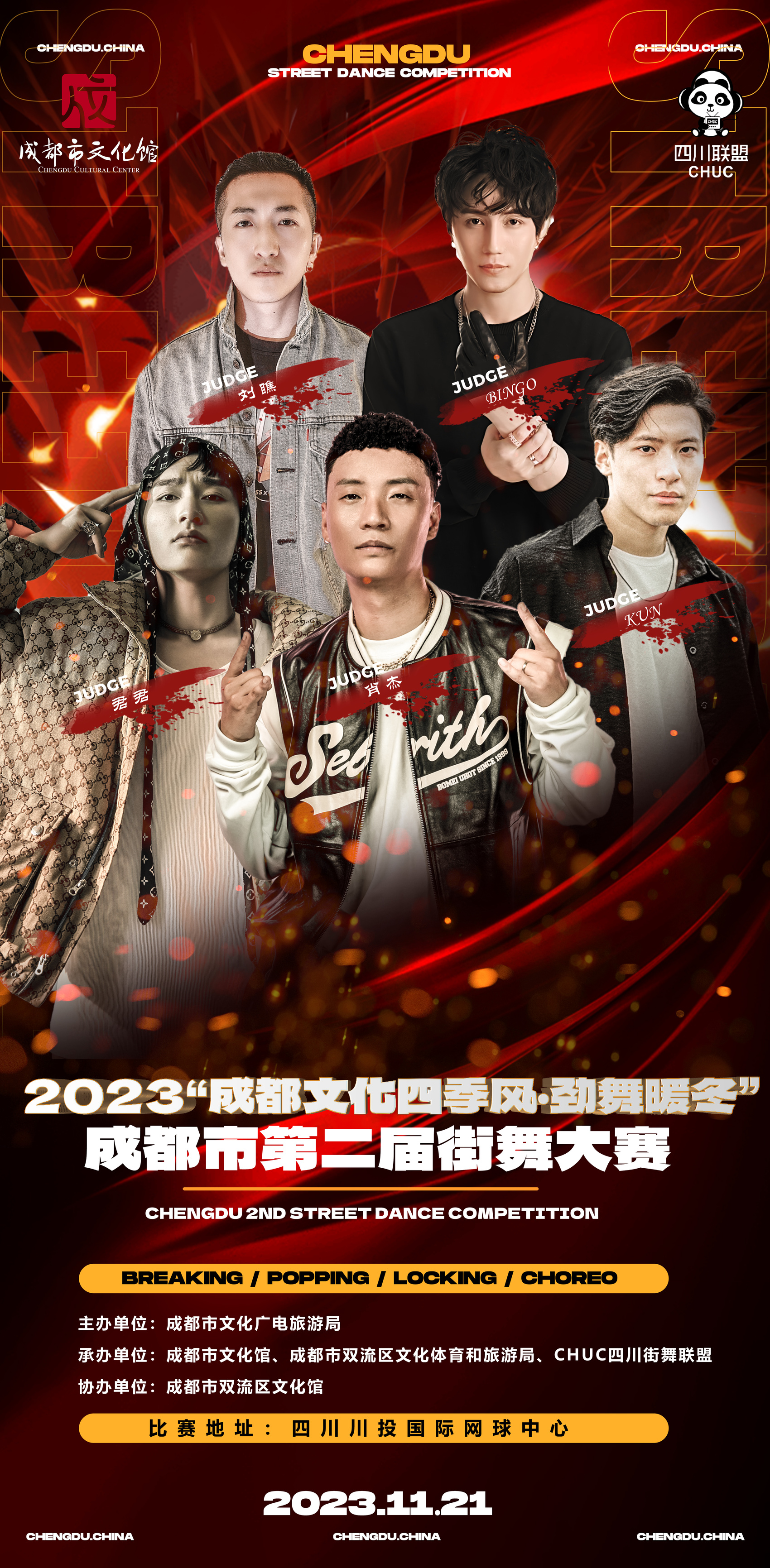 明天下午,2023年“成都文化四季风·劲舞暖冬”成都市第二届街舞大赛作为“安逸四川 劲舞暖冬”四川省首届街舞大赛首场预热活动,将在成都市双流区率先启动。届时,超过20支优秀街舞队伍将参加本次大赛。世界街舞冠军肖杰、全国舞蹈冠军肖智斌、《这就是街舞》人气选手刘瞧、中国顶尖编舞师KUN、中国齐舞大赛冠军君君等国内知名街舞大咖将亮相现场,与市民群众亲密互动。
