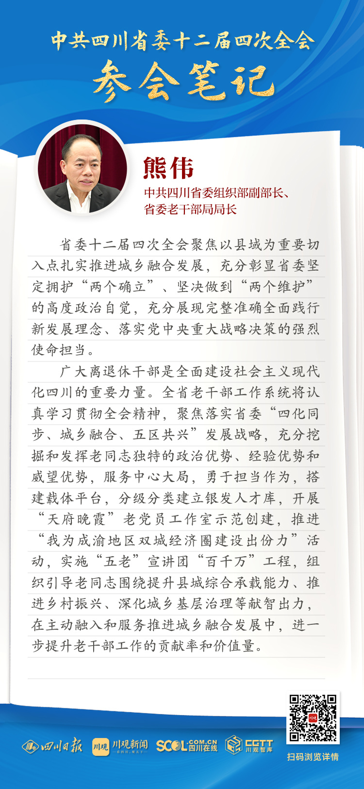 广大离退休干部是全面建设社会主义现代化四川的重要力量。全省老干部工作系统将认真学习贯彻全会精神,聚焦落实省委“四化同步、城乡融合、五区共兴”发展战略,充分挖掘和发挥老同志独特的政治优势、经验优势和威望优势,服务中心大局,勇于担当作为,搭建载体平台,分级分类建立银发人才库,开展“天府晚霞”老党员工作室示范创建,推进“我为成渝地区双城经济圈建设出份力”活动,实施“五老”宣讲团“百千万”工程,组织引导老同志围绕提升县城综合承载能力、推进乡村振兴、深化城乡基层治理等献智出力,在主动融入和服务推进城乡融合发展中,进一步提升老干部工作的贡献率和价值量。