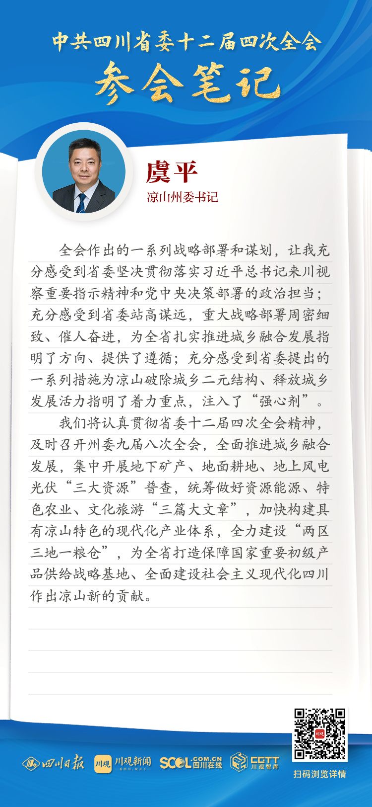 我们将认真贯彻省委十二届四次全会精神,及时召开州委九届八次全会,全面推进城乡融合发展,集中开展地下矿产、地面耕地、地上风电光伏“三大资源”普查,统筹做好资源能源、特色农业、文化旅游“三篇大文章”,加快构建具有凉山特色的现代化产业体系,全力建设“两区三地一粮仓”,为全省打造保障国家重要初级产品供给战略基地、全面建设社会主义现代化四川作出凉山新的贡献。