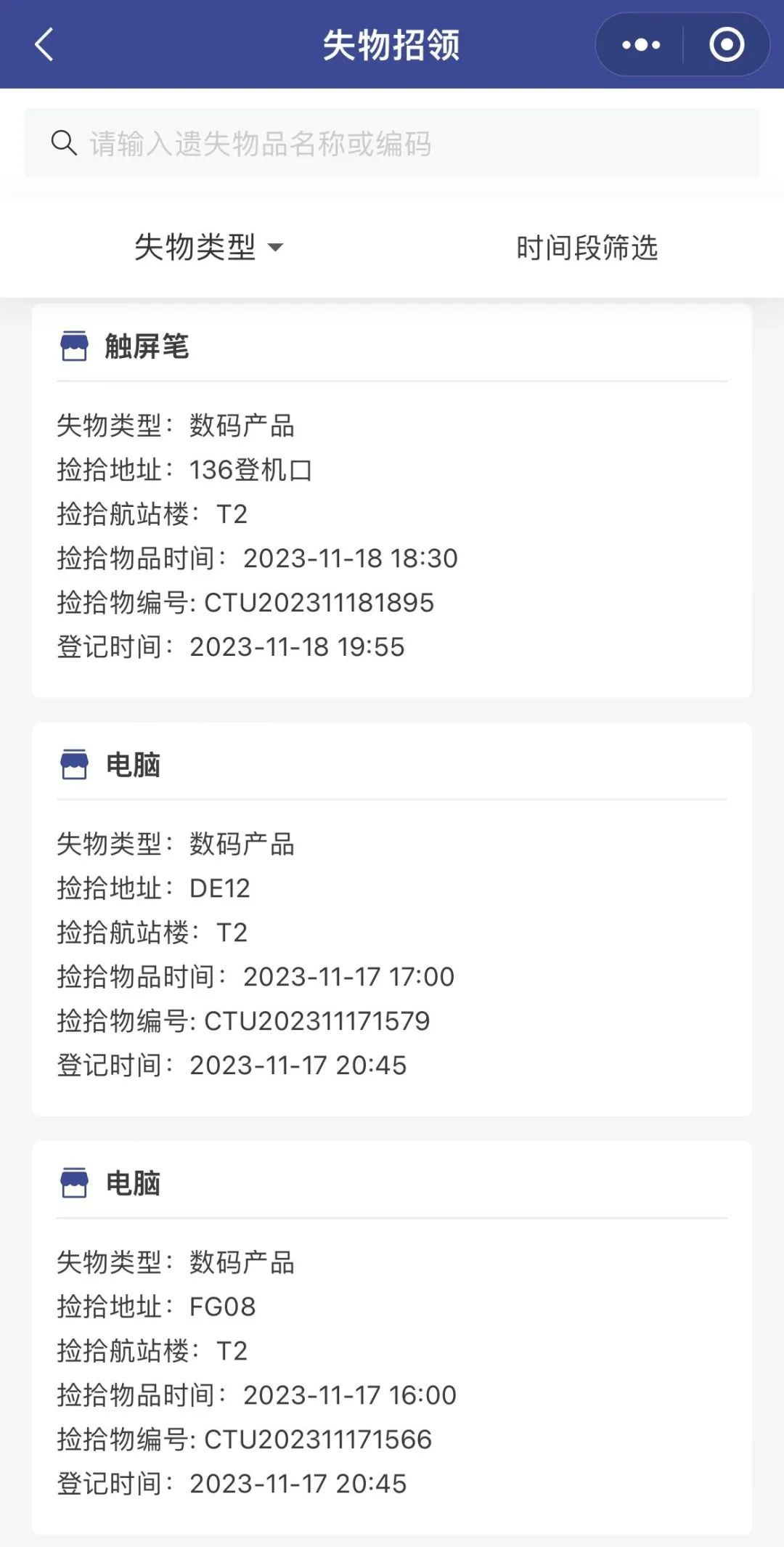▲双流机场、天府机场公示的旅客近日遗失物品