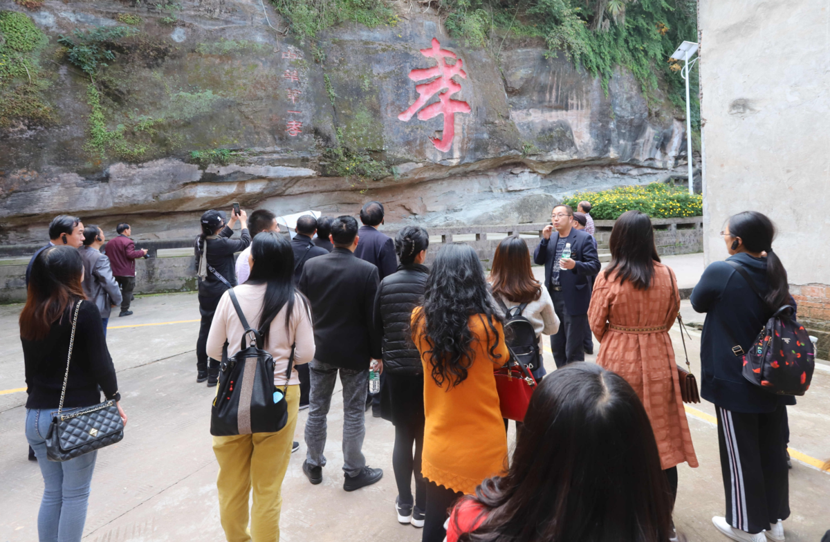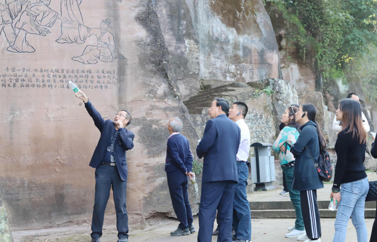 在李密故里,作家们走看了刻画在山体上的一个硕大的“孝”字和一幅幅镌刻着关于李密孝敬祖母故事的壁画,并聆听了解说员讲述的李密孝敬祖母的真情故事。
