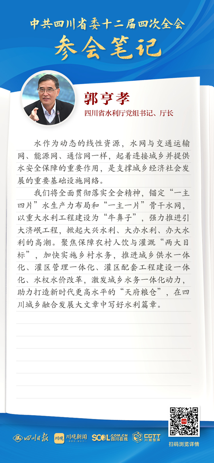 我们将全面贯彻落实全会精神,锚定“一主四片”水生产力布局和“一主一片”骨干水网,以重大水利工程建设为“牛鼻子”,强力推进引大济岷工程,掀起大兴水利、大办水利、办大水利的高潮。聚焦保障农村人饮与灌溉“两大目标”,加快实施乡村水务,推进城乡供水一体化、灌区管理一体化、灌区配套工程建设一体化、水权水价改革,激发城乡水务一体化动力,助力打造新时代更高水平的“天府粮仓”,在四川城乡融合发展大文章中写好水利篇章。