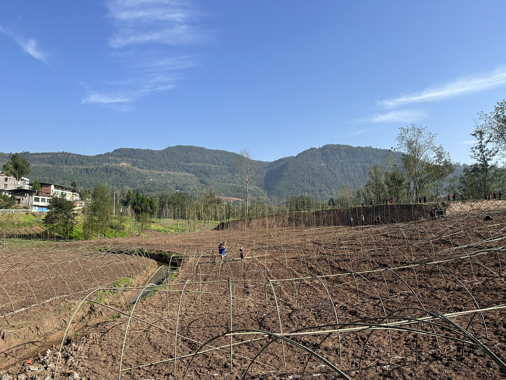 时下,正值羊肚菌的播种期。近日,在巴中市平昌县白衣镇鱼滩社区羊肚菌种植基地,一排排高标准种植搭棚已初具雏形,密密麻麻地分布在山坡上。村民们正在平整土地、加固大棚,一片繁忙。