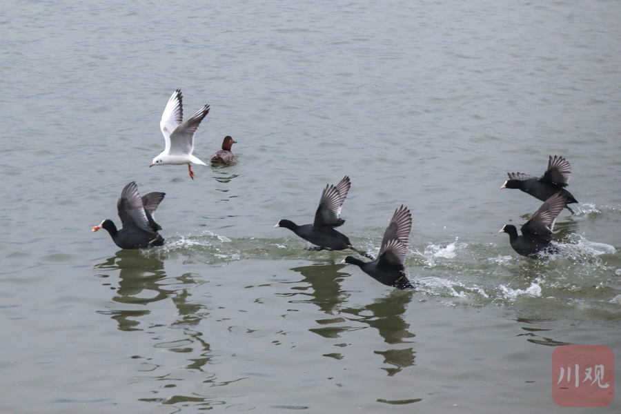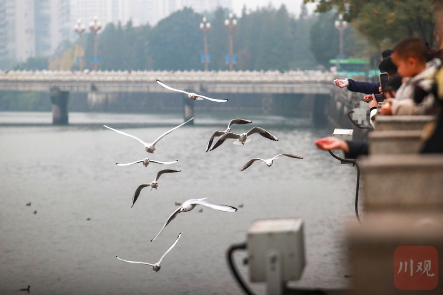 红嘴鸥、沙秋鸭、鸳鸯……11月20日,在雅安雨城区青衣江面,成群的越冬鸟儿在河面上嬉戏觅食,一派生机勃勃的景象;江畔的熊猫大道旁,观鸟的市民络绎不绝,成为初冬时节一道亮丽的风景线。
