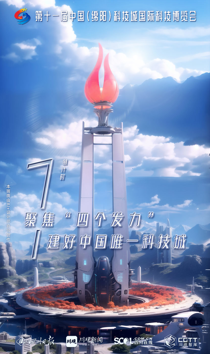 川观新闻选取绵阳最具代表性的多个地标建筑作为制图元素,与科技元素相融合,制作系列倒计时海报。值得一提的是,系列海报均是由AI生成、人工微调进行生产。