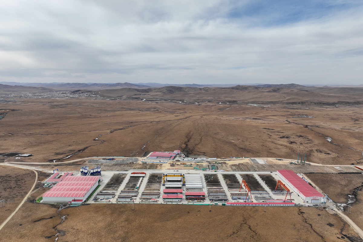 这是个占地146亩的方形场地。“这里地处草原湿地,表层覆盖了4米多厚的腐殖土,物体放在上面就沉。”制梁场副总工蔡飞介绍,项目团队今年2月进场后,用2个月时间清理了38.9万方腐殖土,再回填、打混凝土,才建成了梁场。