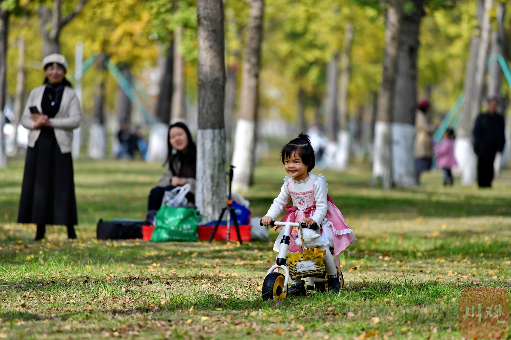 2023年11月22日,一名小朋友在电子科技大学清水河校区银杏林中玩耍。