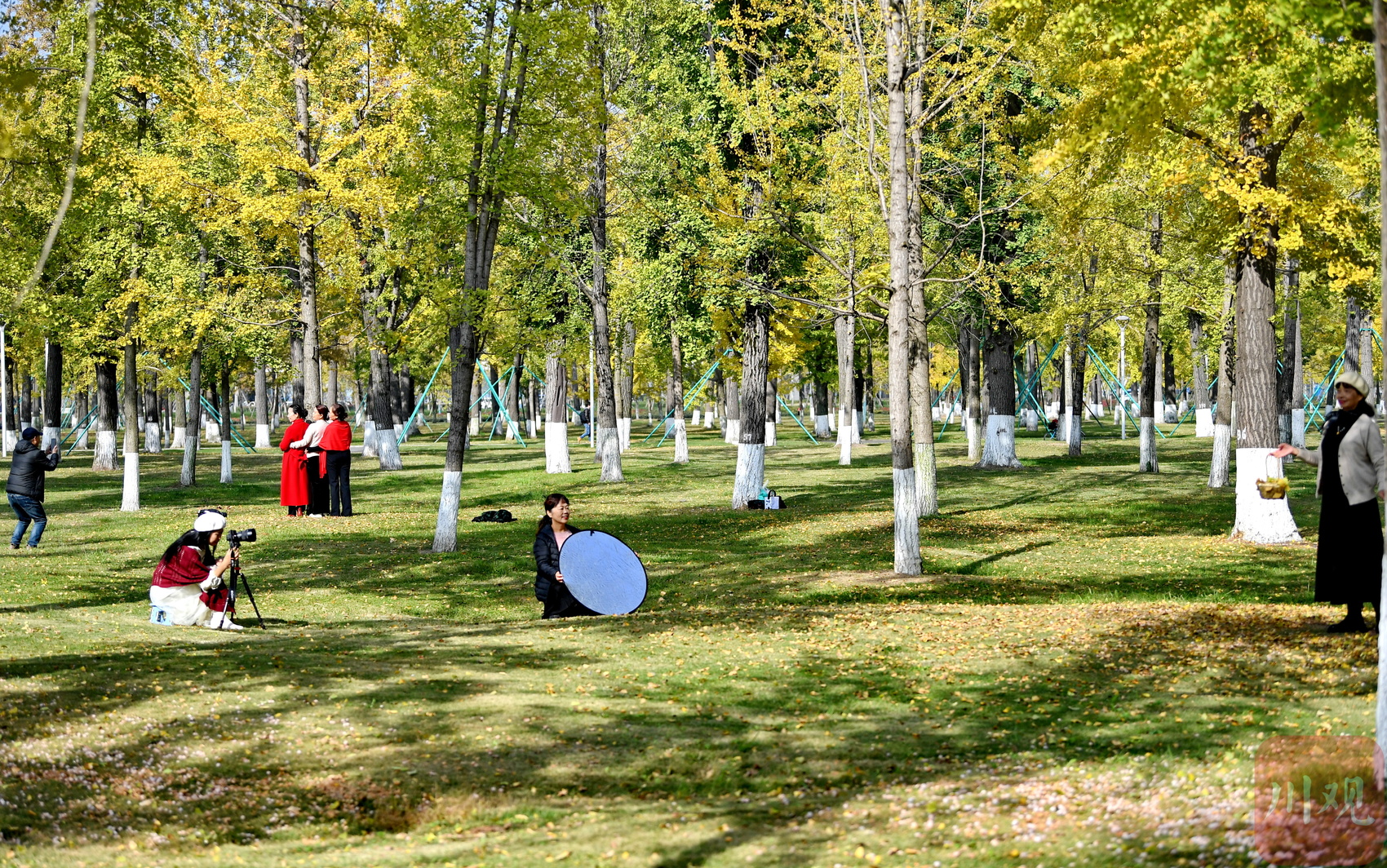 2023年11月22日,市民在电子科技大学清水河校区银杏林中拍照打卡。