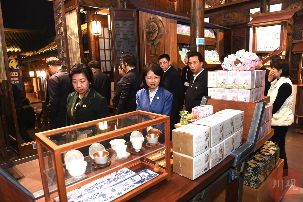 宽窄巷子位于成都市青羊区长顺街附近,由宽巷子、窄巷子、井巷子平行排列组成,大片青黛砖瓦的仿古四合院落坐落其间。当晚7时过,宽窄巷子正是游人高峰时段,代表团一行走进位于宽巷子的稷下鲁班工坊。游客们正围坐在一张张茶桌前,桌上摆着盖碗茶、茶叶盒以及一些王者荣耀IP的产品。这里是王者荣耀全国首家授权文创店,传统天府文化和热门游戏IP在这里发生碰撞。