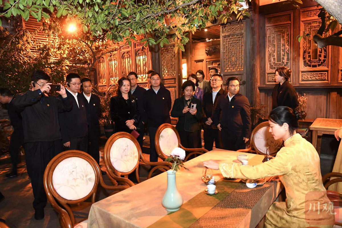 川西悠闲的喝茶场景,在宽窄巷子随处可见。在宽巷子的一间茶坊,几位代表团成员现场品尝黄茶后,详细询问了商家的经营情况。考察中,很多代表团成员对宽窄巷子的历史和招商情况较为关注,讲解员分别从全面修复保护、统一招商方面进行讲解。