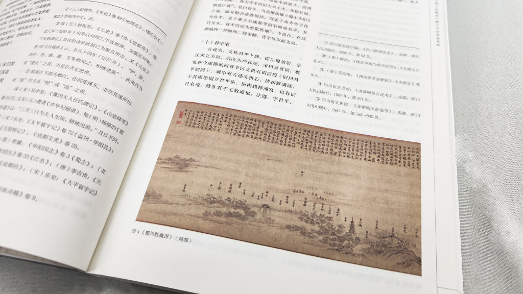 从图上的“不变”之处,我们可以看到天府文化的悠久传承。打开本书收录的历史最早的北宋名画《蜀川胜概图》,青城山、浣花溪、昭觉寺、大慈寺……山水胜景与城市人居面貌跃然纸上。有学者统计,全图收录的约190个地名中,不少流传至今,仍在使用。这幅古代山水长卷以灵动的风格将城市、山岳、水道等地理信息和人文要素和谐共存。