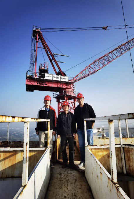 戴靠山(中)在风电场现场试验与超高层施工现场。