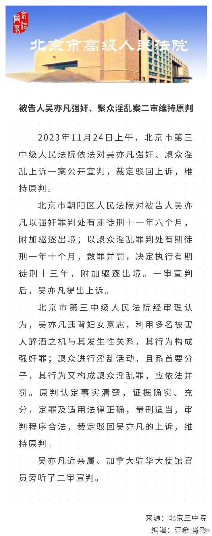 2023年11月24日上午,北京市第三中级人民法院依法对吴亦凡强奸、聚众淫乱上诉一案公开宣判,裁定驳回上诉,维持原判。