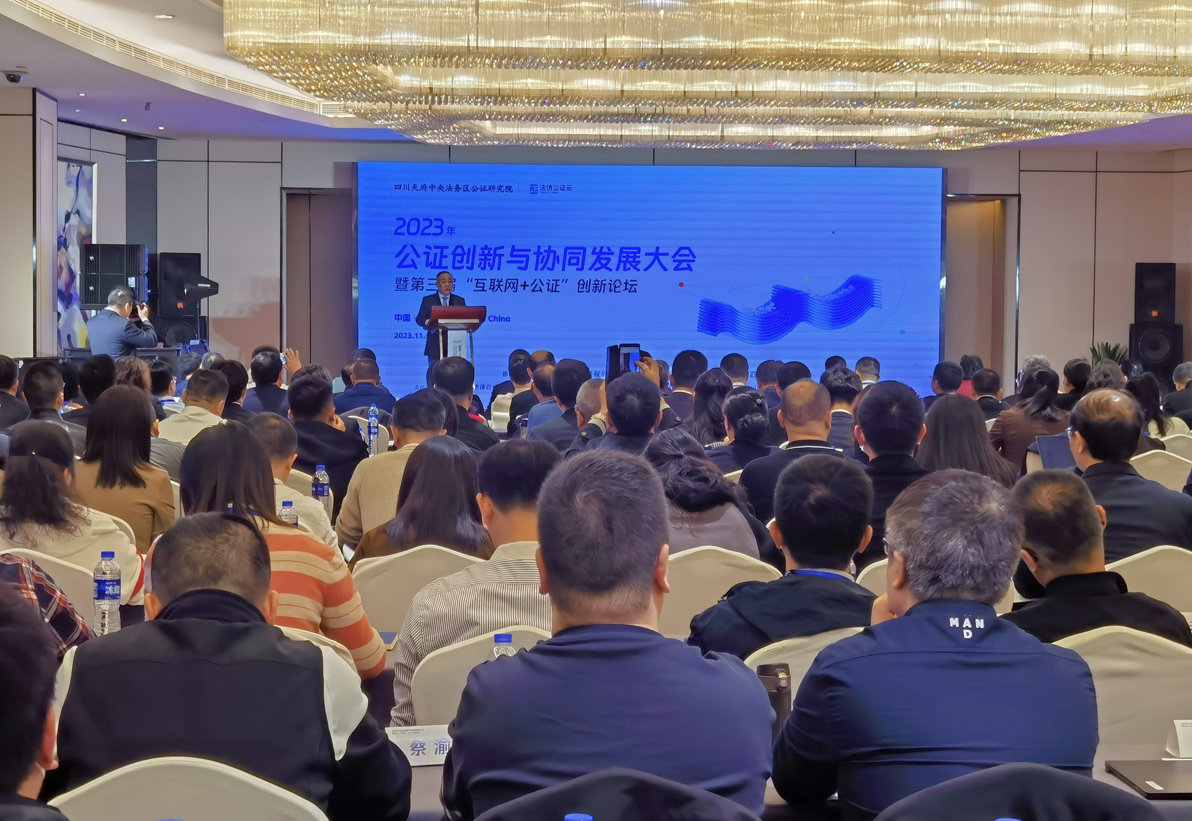 11月23日,由四川天府中央法务区公证研究院、法信云(成都)科技有限公司主办的2023年公证创新与协同发展大会暨第三届“互联网+公证”创新论坛在成都举行,百余名行业相关人士齐聚蓉城,探讨公证业务创新、在线公证应用与发展前景等问题。