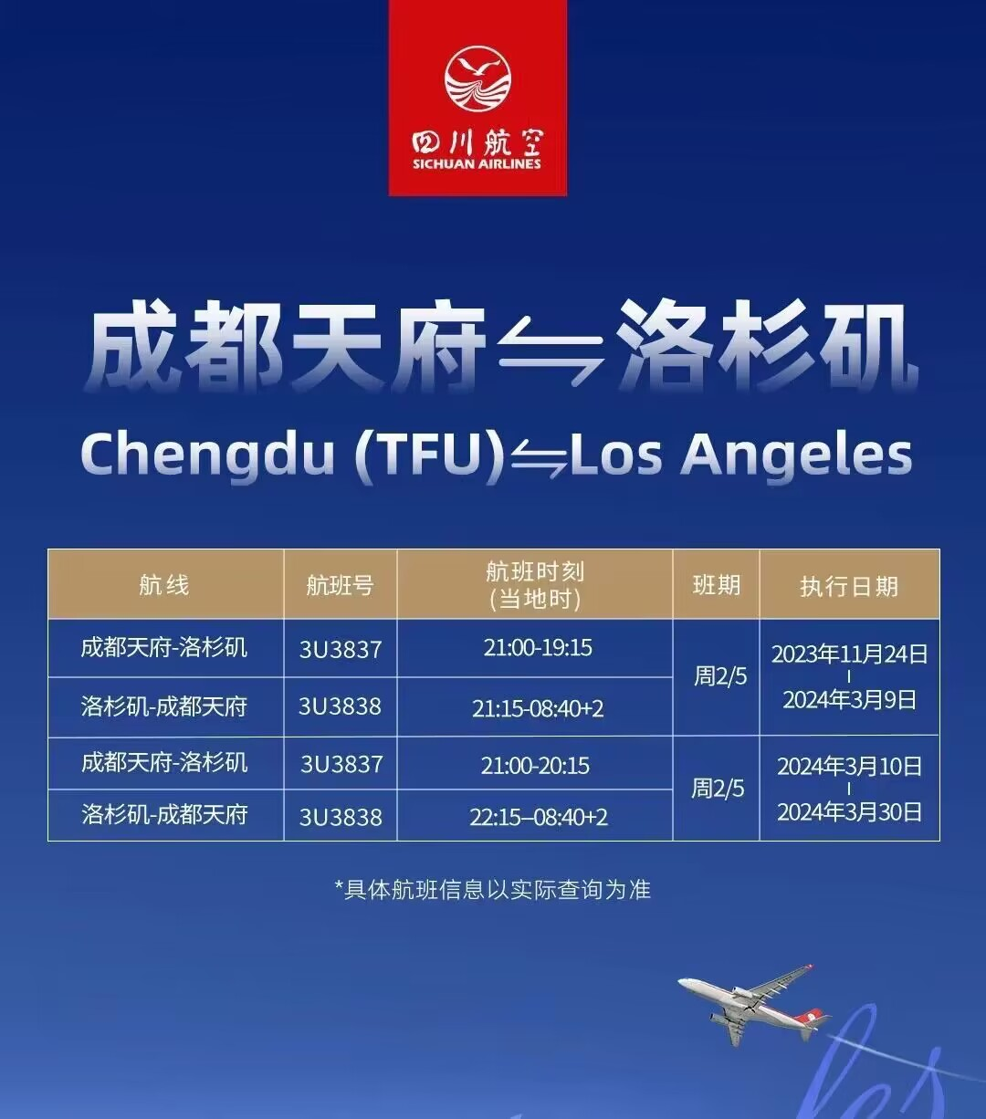 据了解,该航线每周往返各两班,分别于每周二、五执行。去程航班号为3U3837,21:15从天府机场起飞,空中飞行时间为14小时;返程航班号为3U3838,当地时间21:15从洛杉矶机场起飞,旅程时间19时25分钟。从2024年3月10日起,航班时刻有微调。