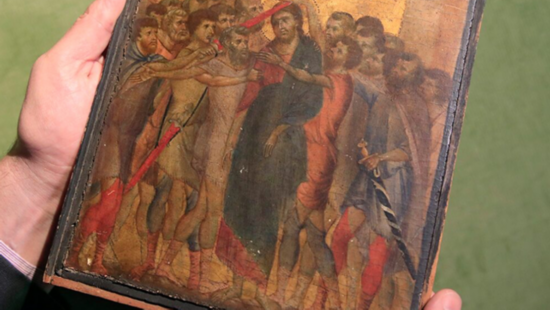 这幅《嘲弄基督》创作于1280年,宽20厘米、高约25厘米,是多联屏画作(共8幅)中的一幅。除去这幅,这组画作中另有两幅流传至今,分别由美国纽约弗里克美术收藏馆和英国国家美术馆收藏。