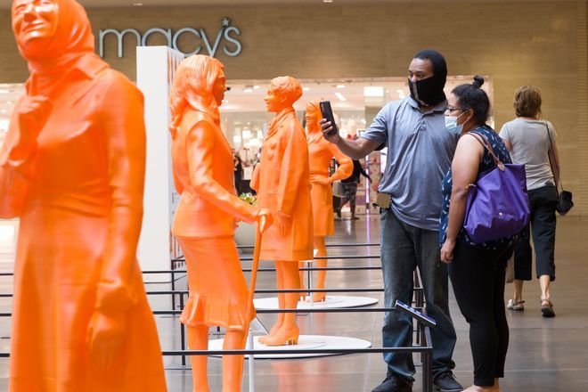 2020年10月15日,在美国达拉斯一家购物中心,人们观看3D打印的女性雕像。图据新华社