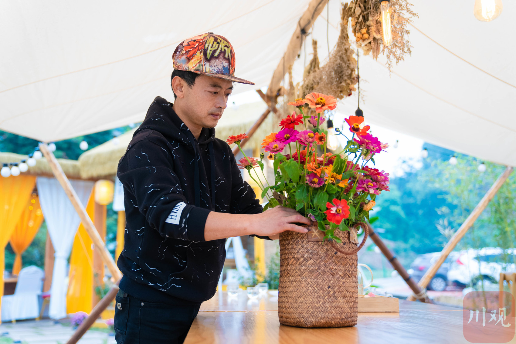 原野民宿向凯峰正在为民宿制作餐桌美陈。 李强 摄